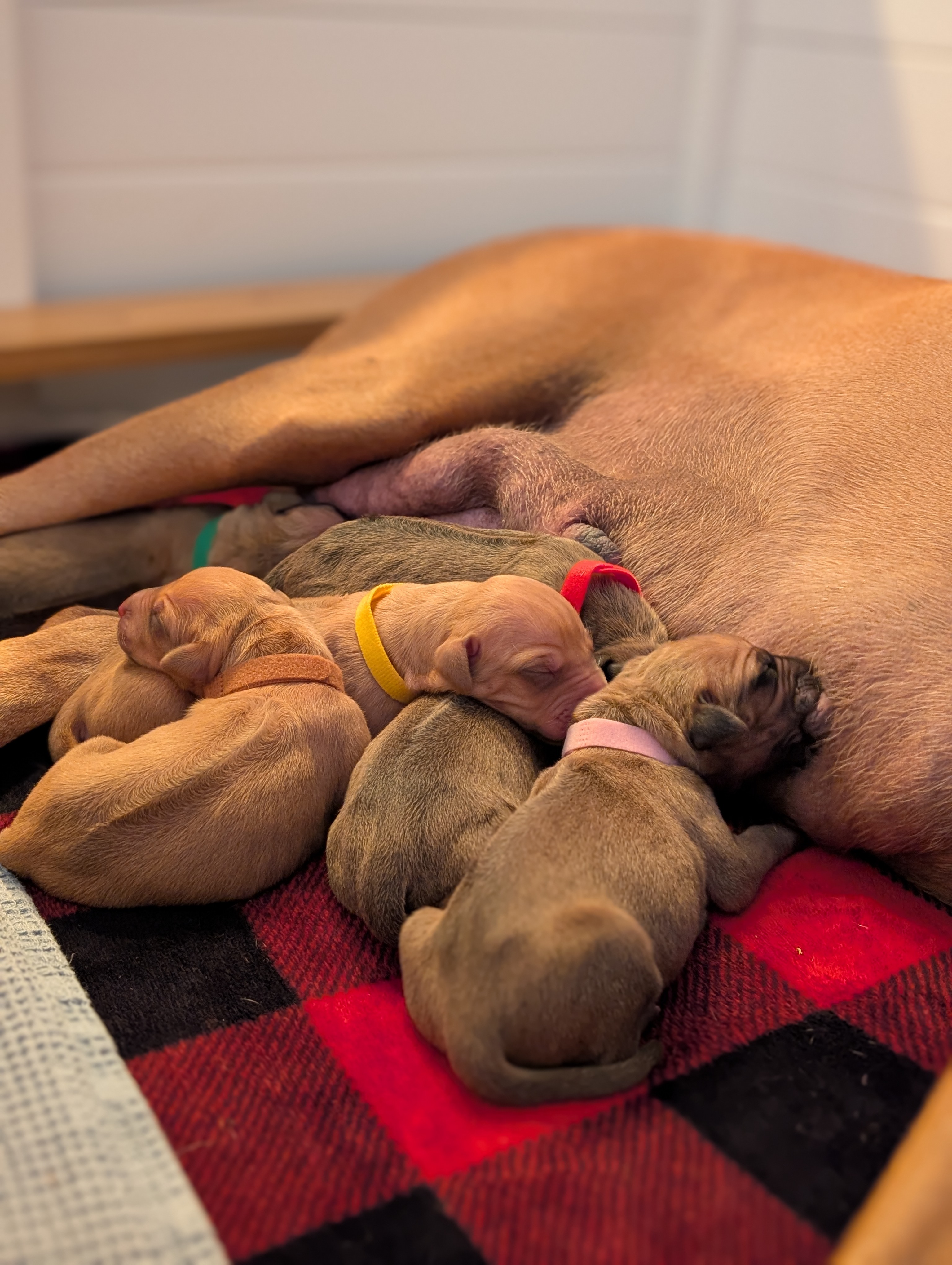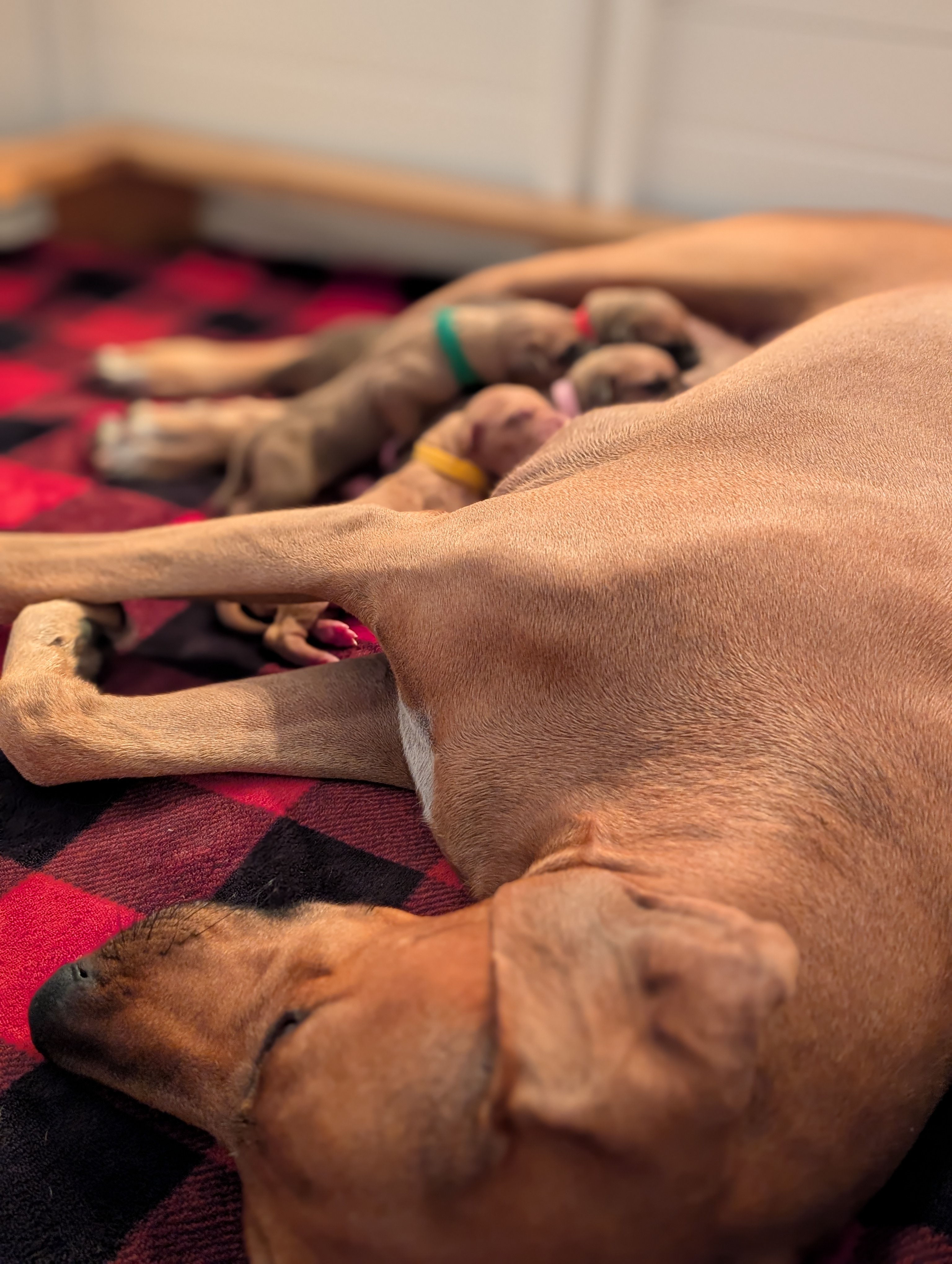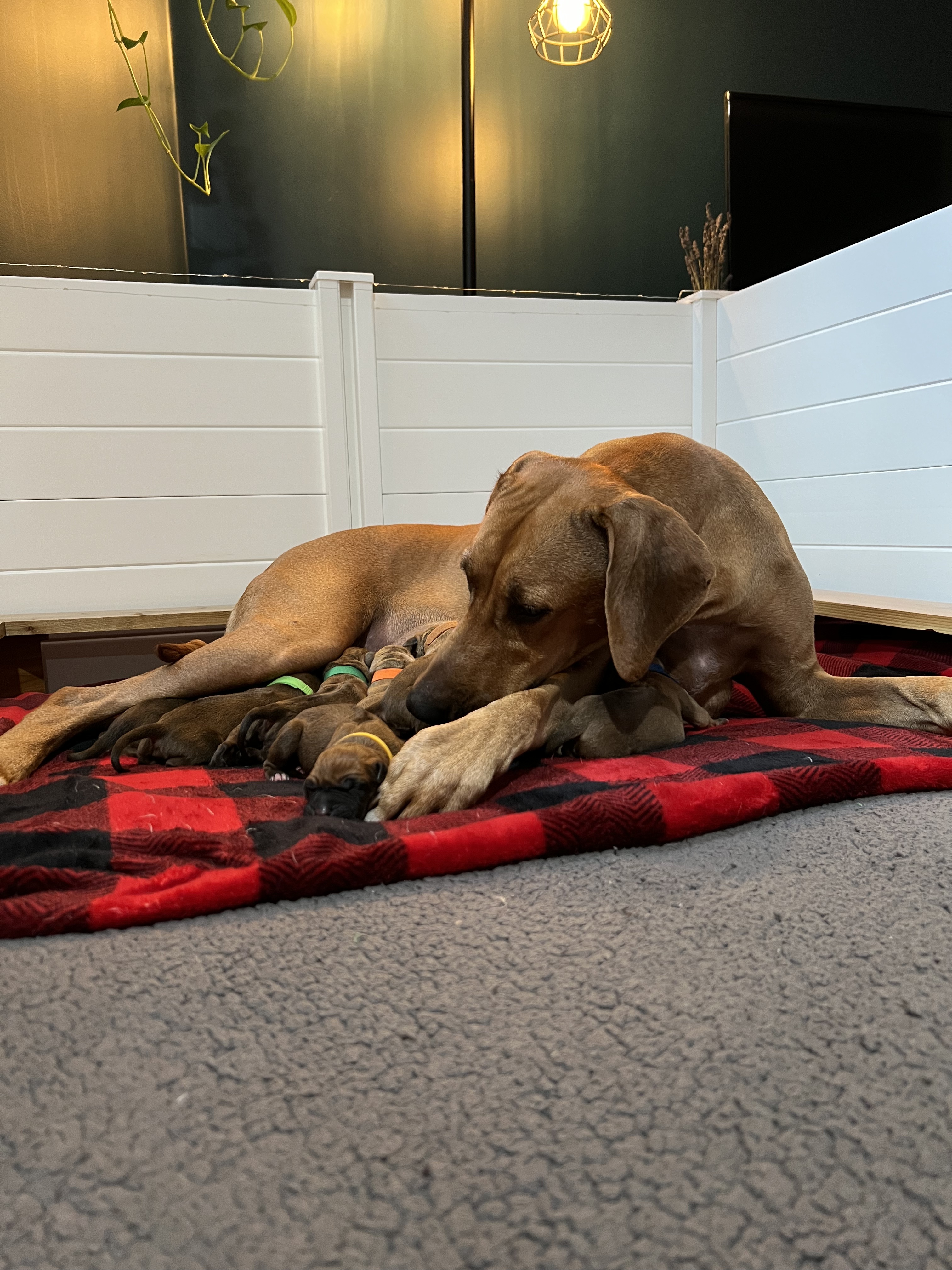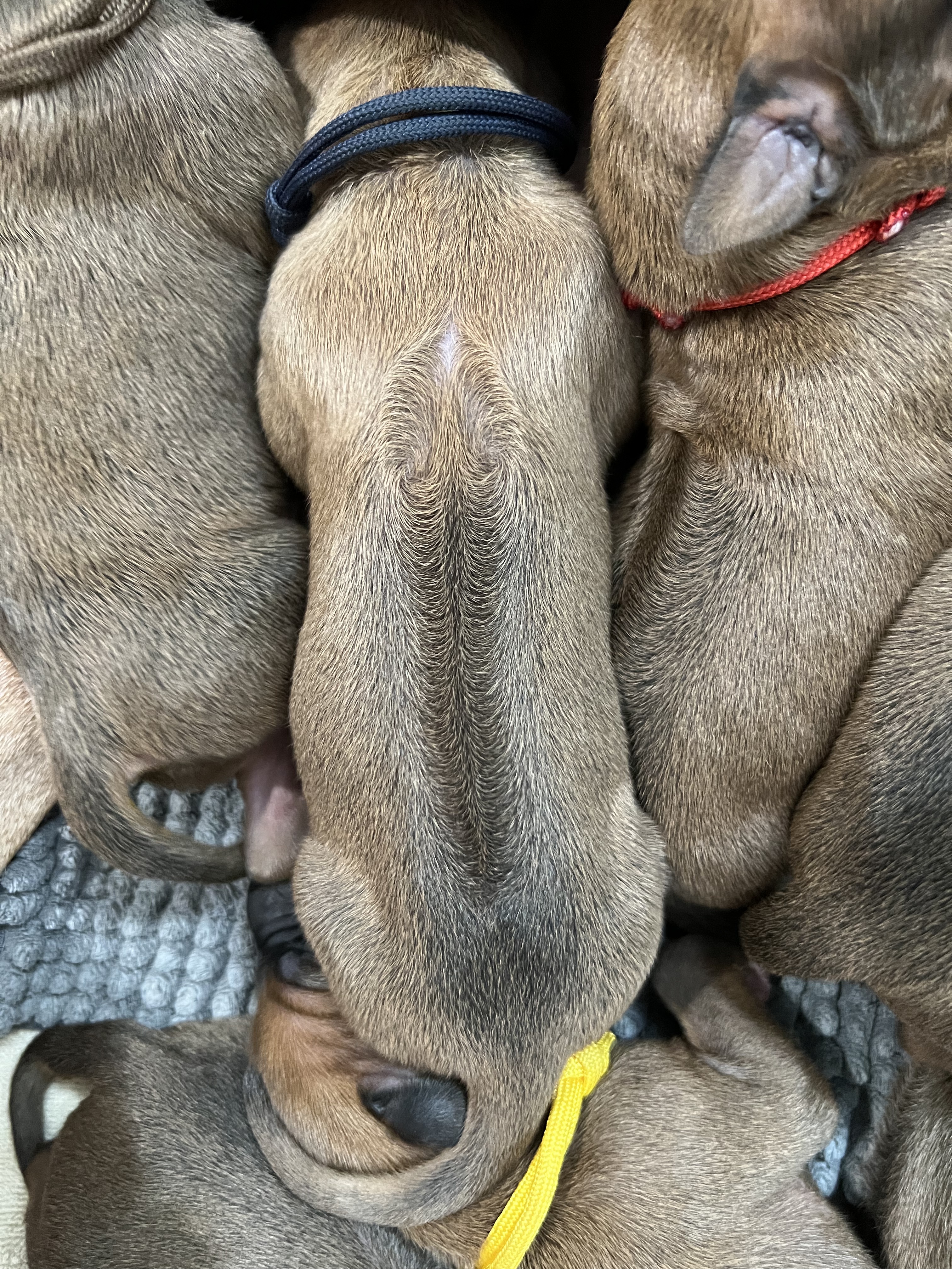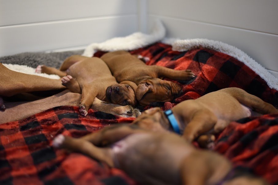In the early hours of August 2nd, we welcomed the beautiful Happy Hour litter. A lovely split of 3 males and 3 females, everyone has lovely ridges with minimal white. There are two livernoses in this litter (one male, one female). We have two puppies with very small kinks, and zero dermoid sinus detected. I am so very excited to watch this beautiful litter grow!