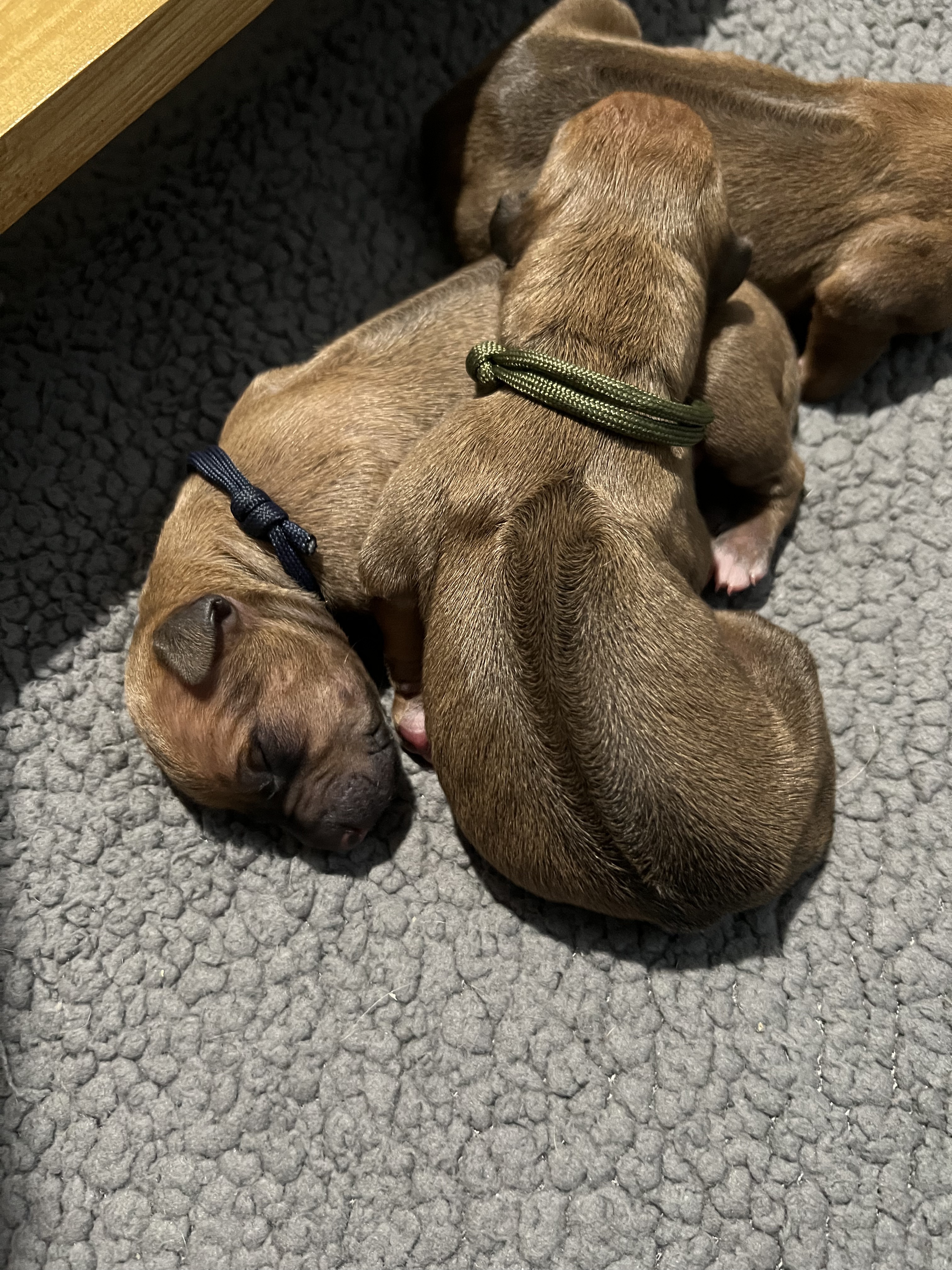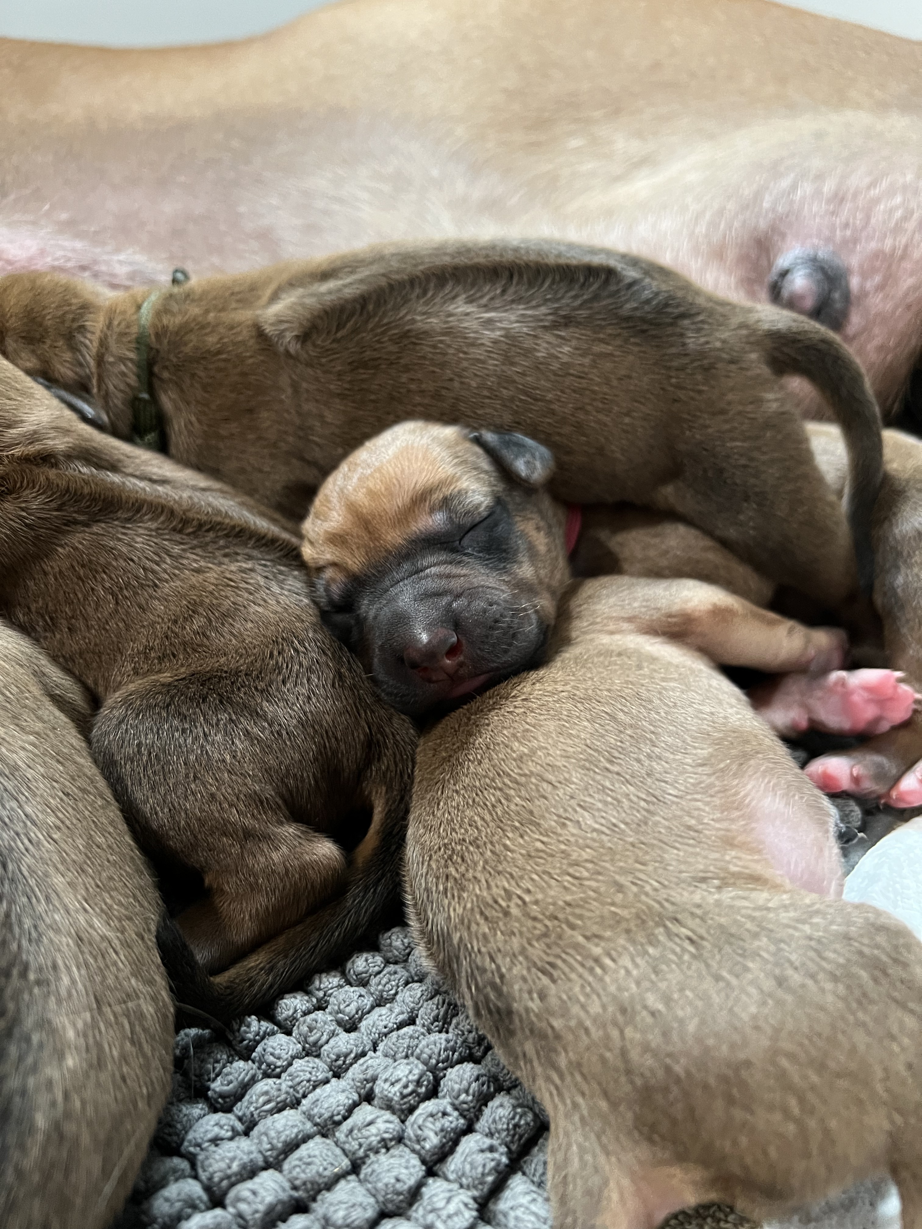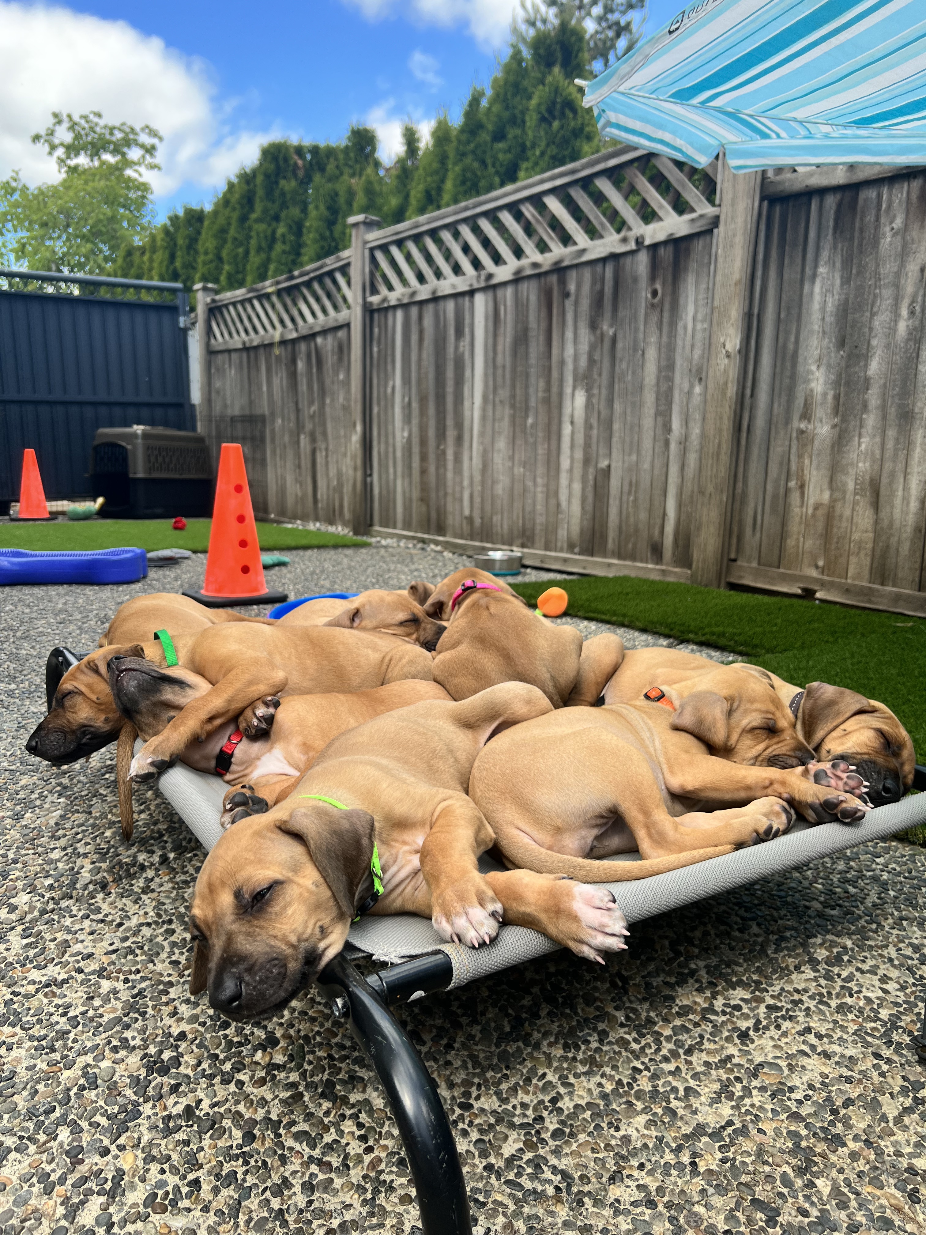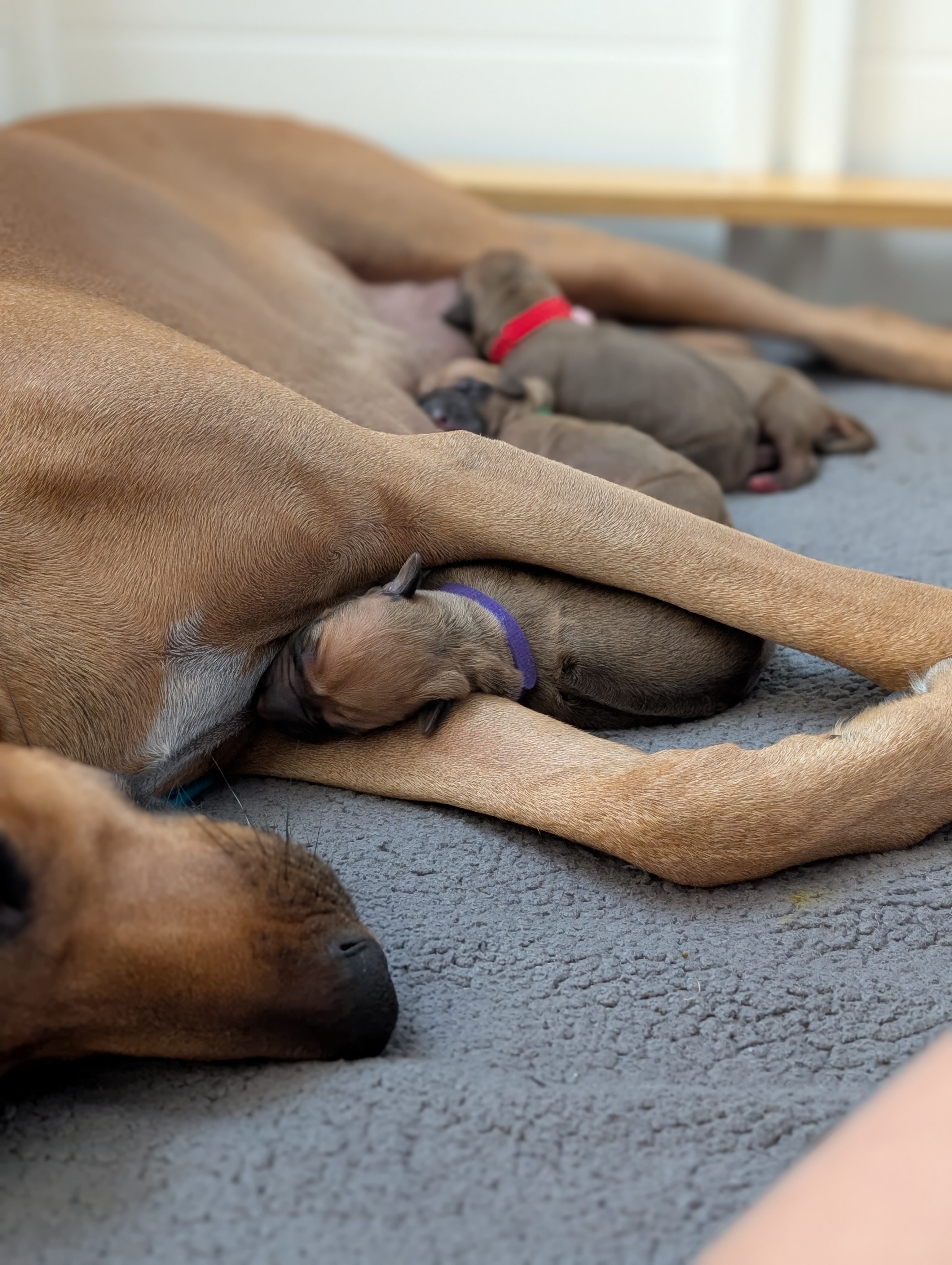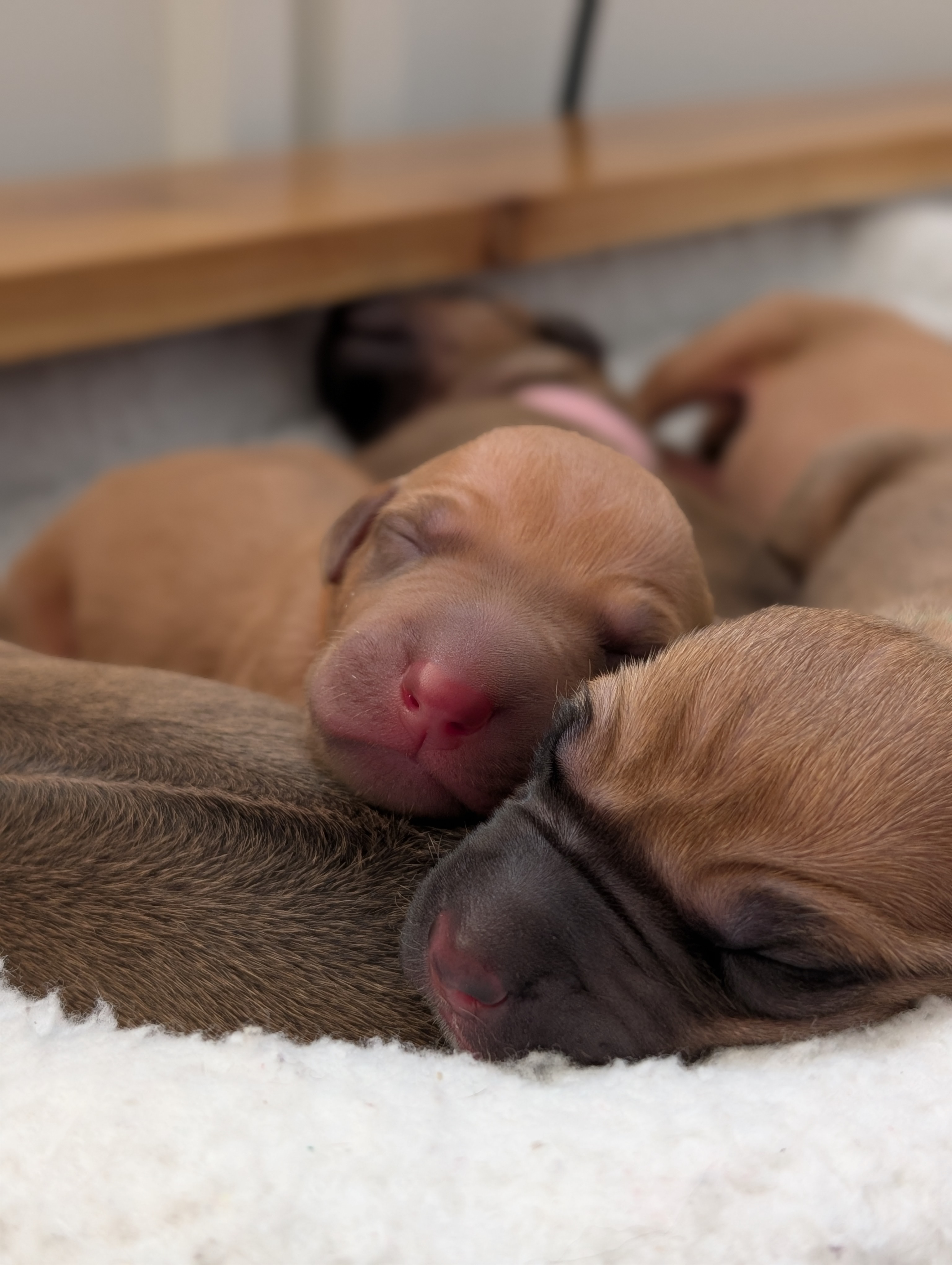 In the early hours of August 2nd, we welcomed the beautiful Happy Hour litter. A lovely split of 3 males and 3 females, everyone has lovely ridges with minimal white. There are two livernoses in this litter (one male, one female). We have two puppies with very small kinks, and zero dermoid sinus detected. I am so very excited to watch this beautiful litter grow!