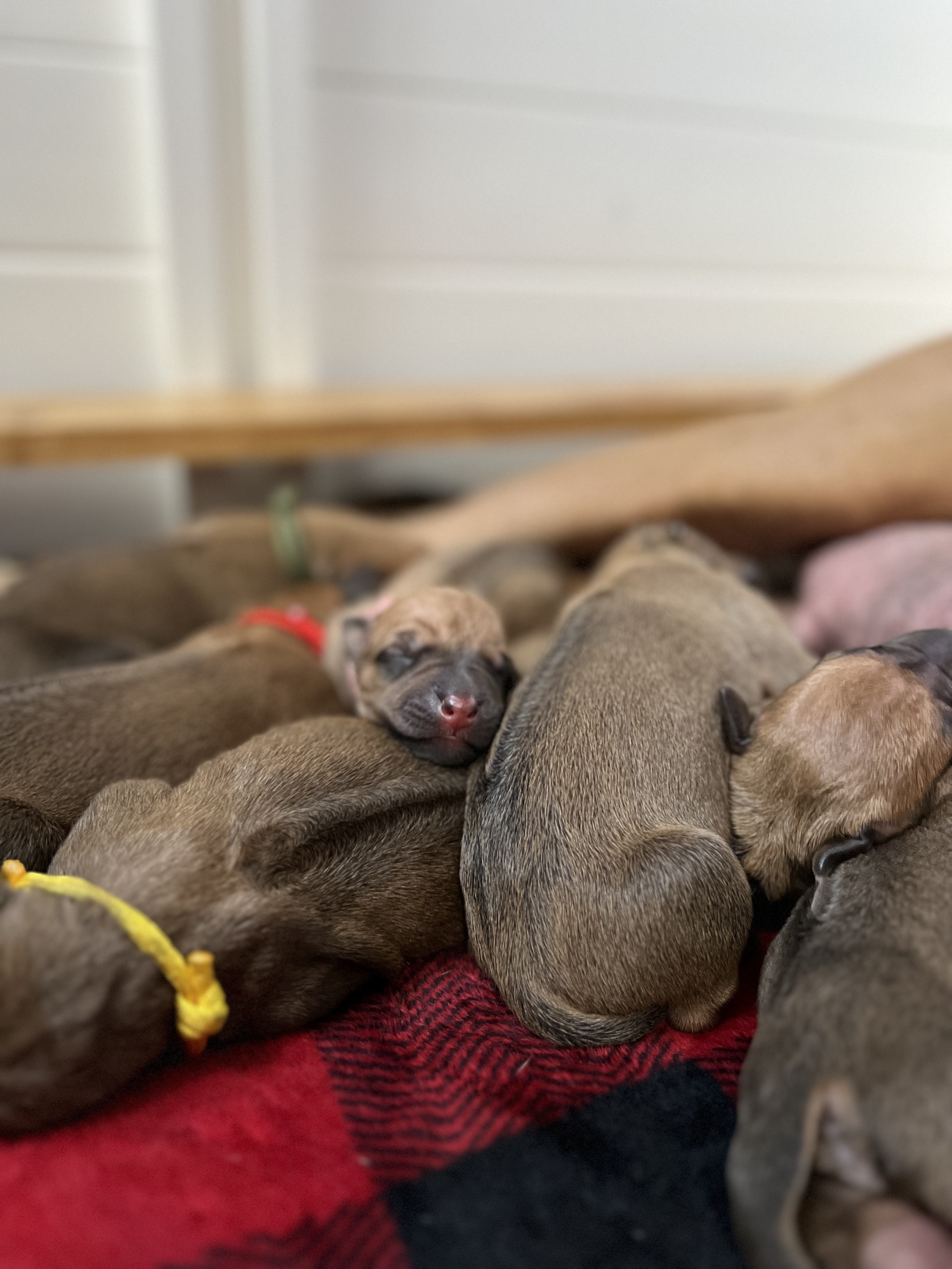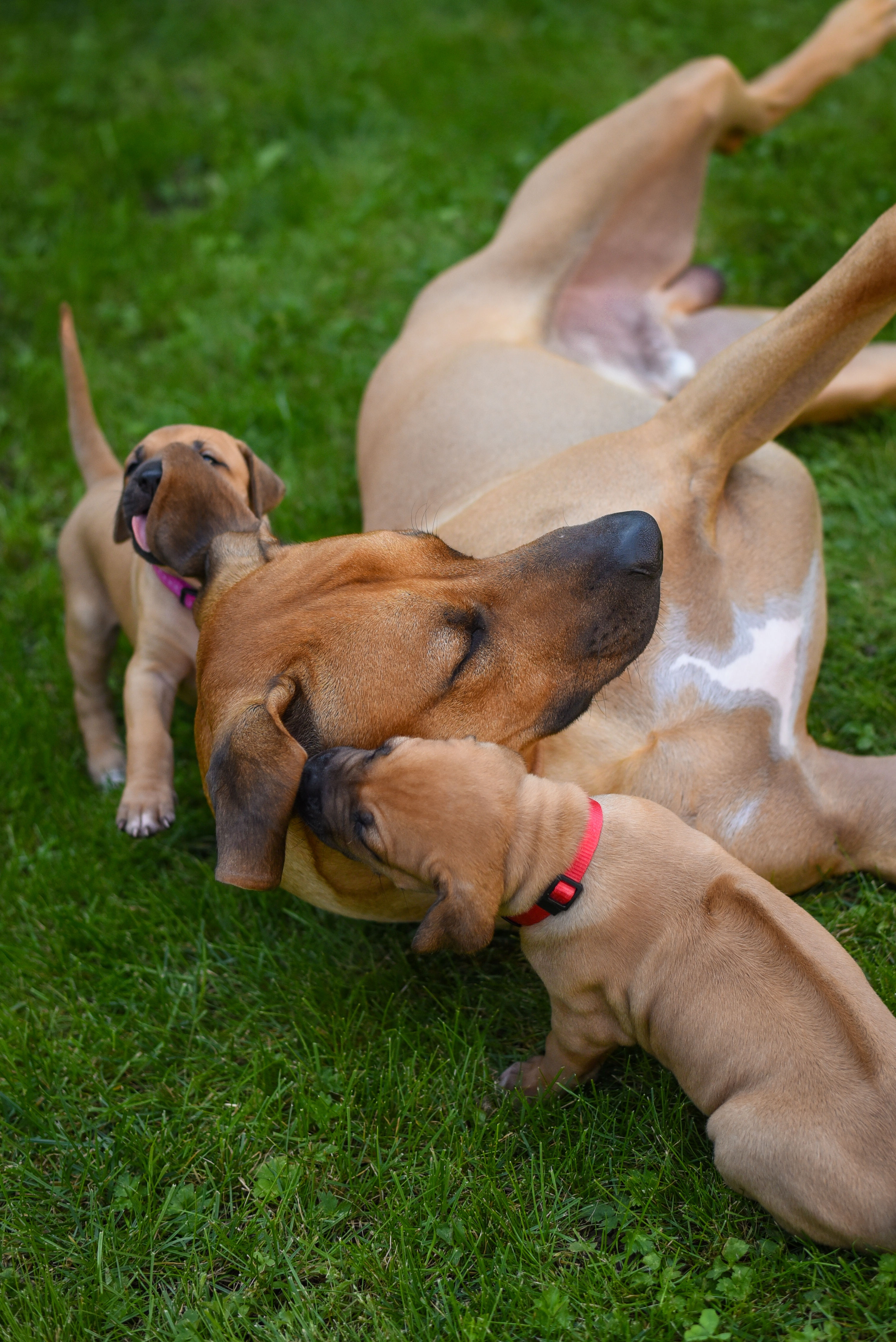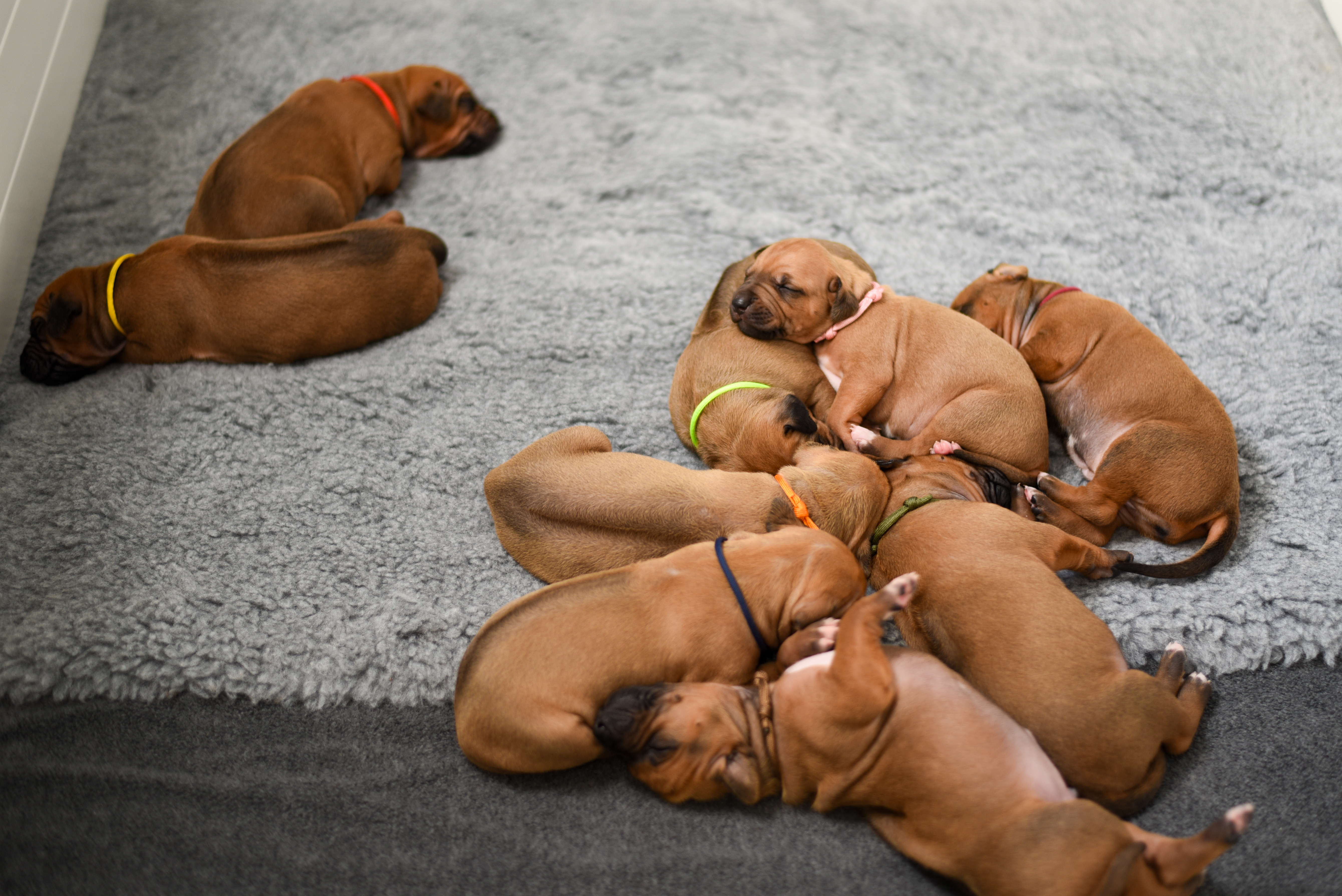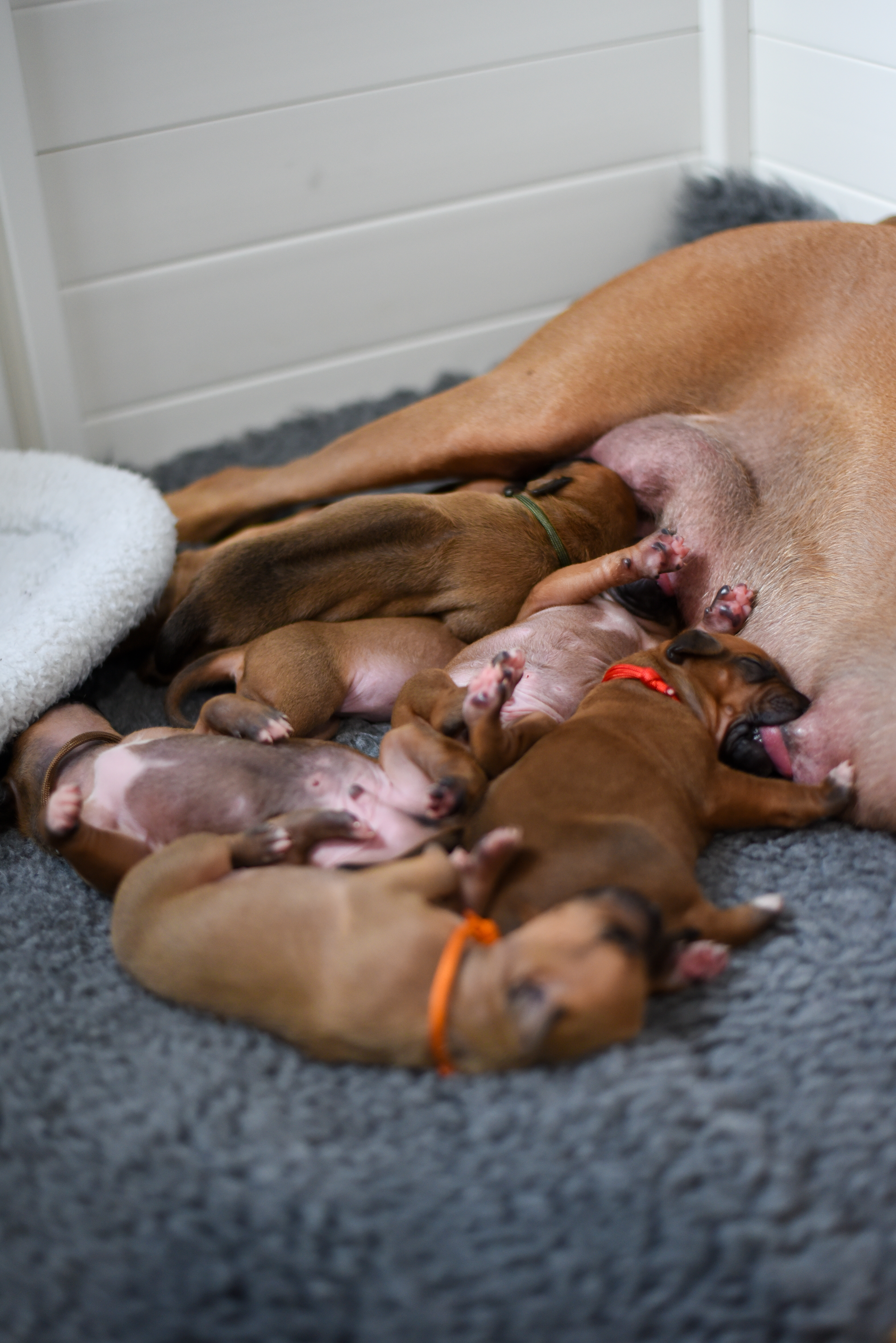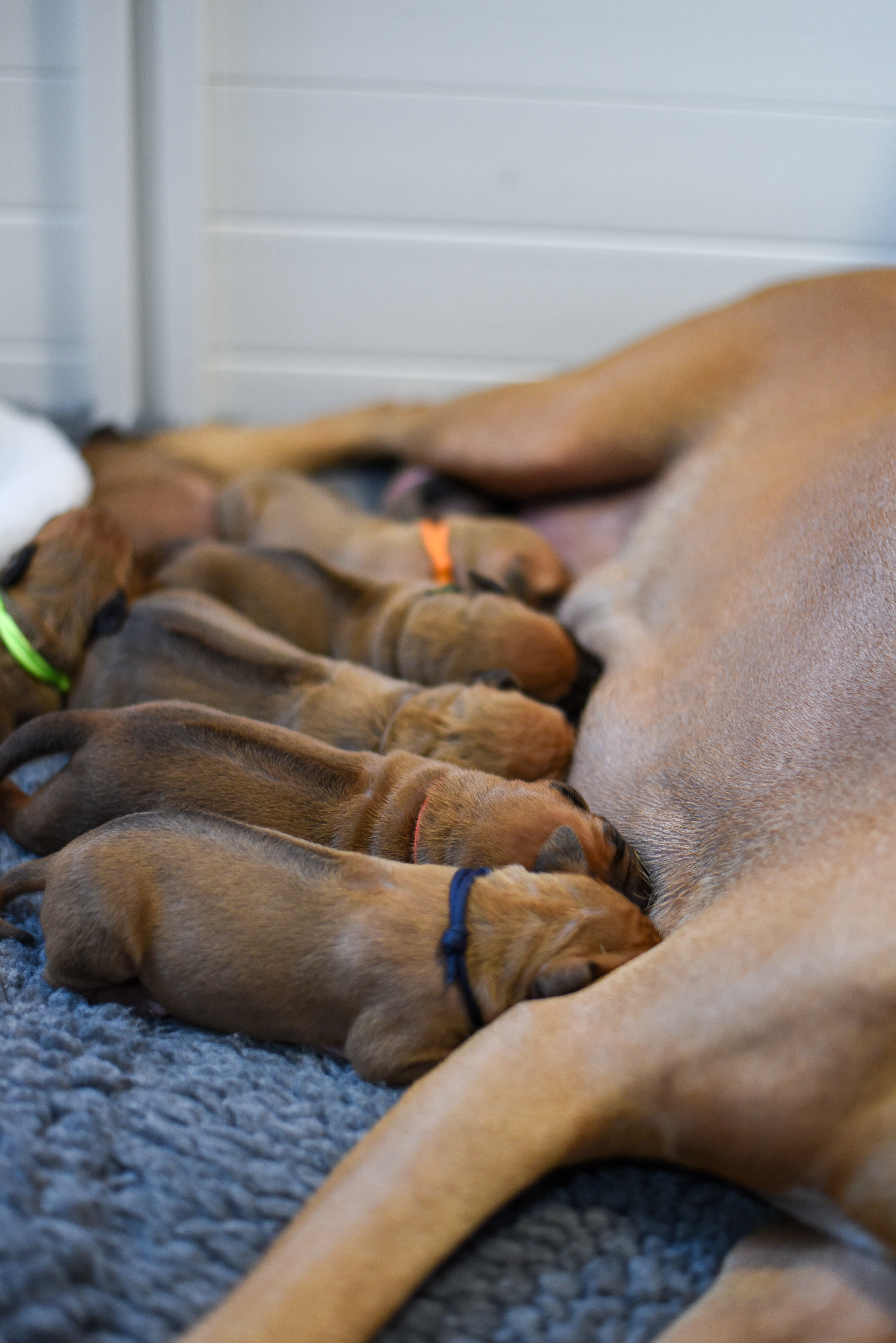 In the early hours of August 2nd, we welcomed the beautiful Happy Hour litter. A lovely split of 3 males and 3 females, everyone has lovely ridges with minimal white. There are two livernoses in this litter (one male, one female). We have two puppies with very small kinks, and zero dermoid sinus detected. I am so very excited to watch this beautiful litter grow!