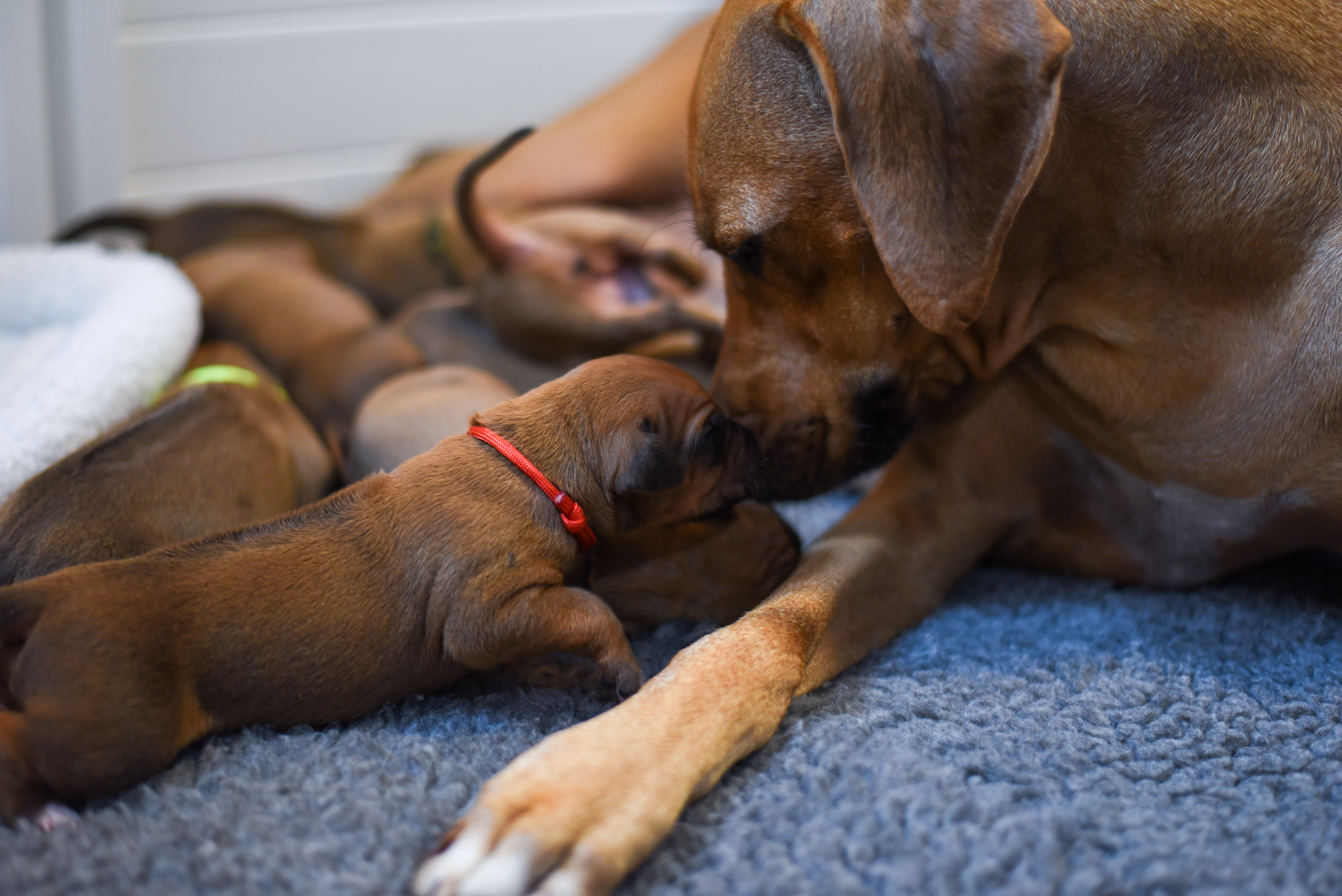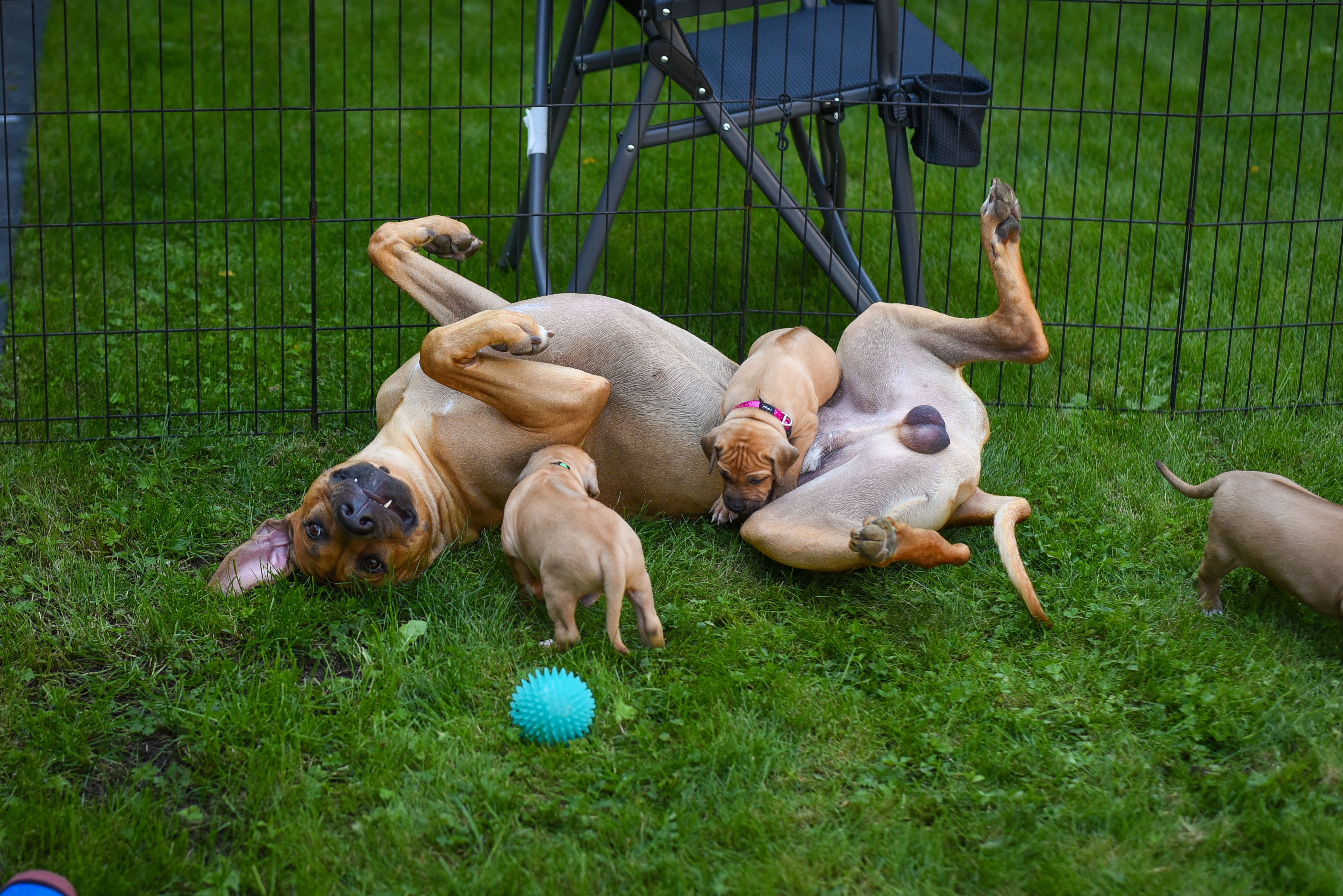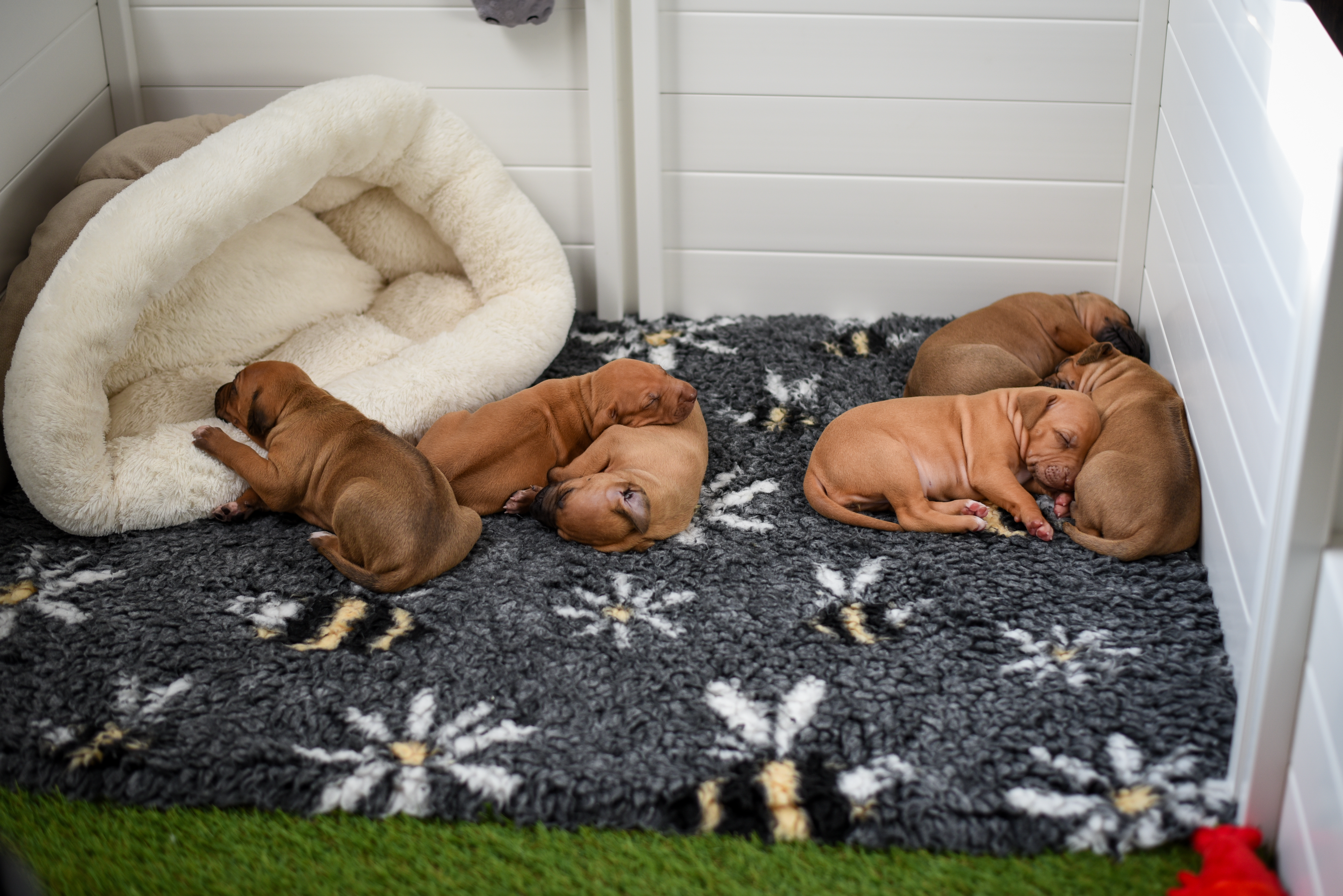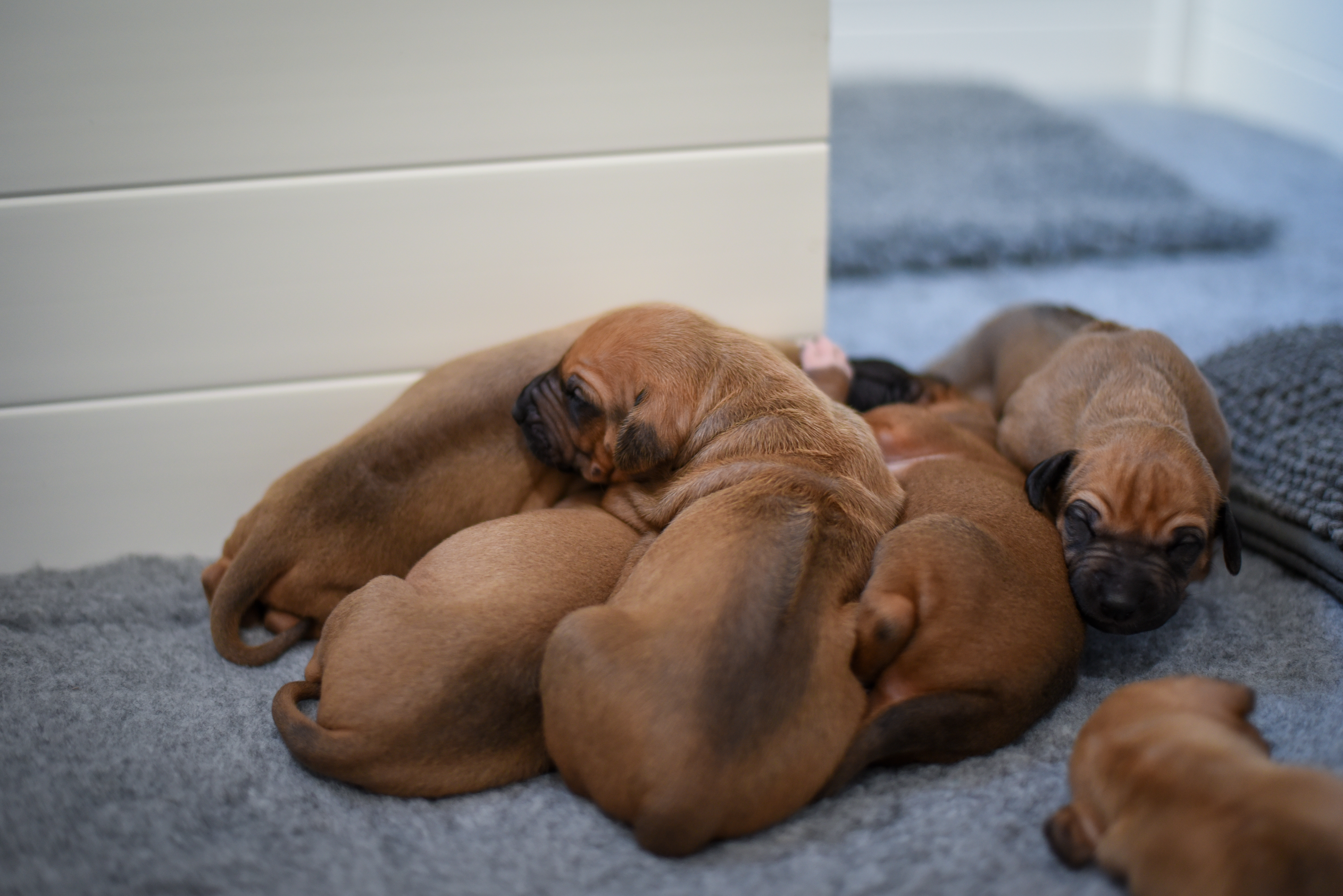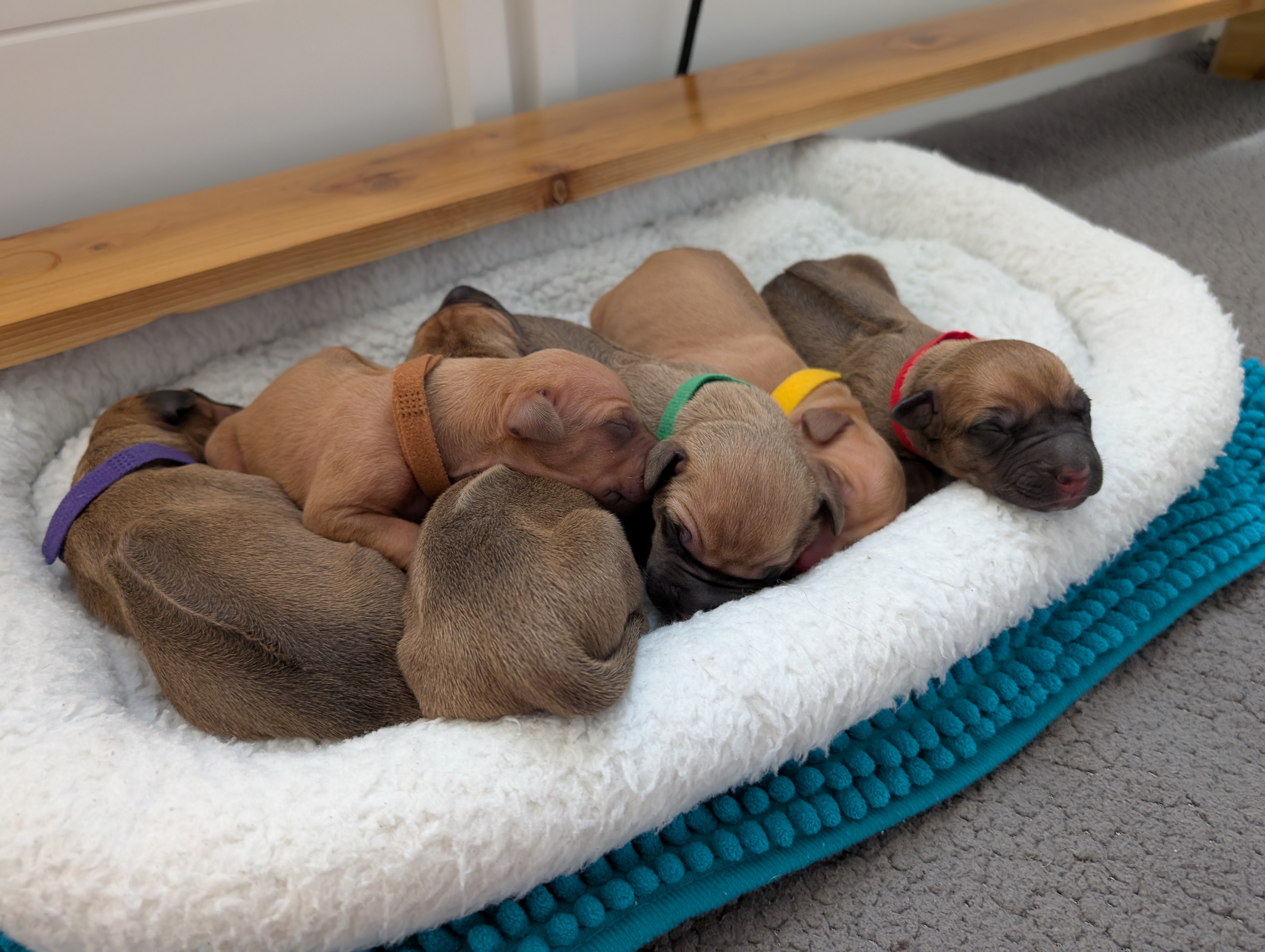 In the early hours of August 2nd, we welcomed the beautiful Happy Hour litter. A lovely split of 3 males and 3 females, everyone has lovely ridges with minimal white. There are two livernoses in this litter (one male, one female). We have two puppies with very small kinks, and zero dermoid sinus detected. I am so very excited to watch this beautiful litter grow!