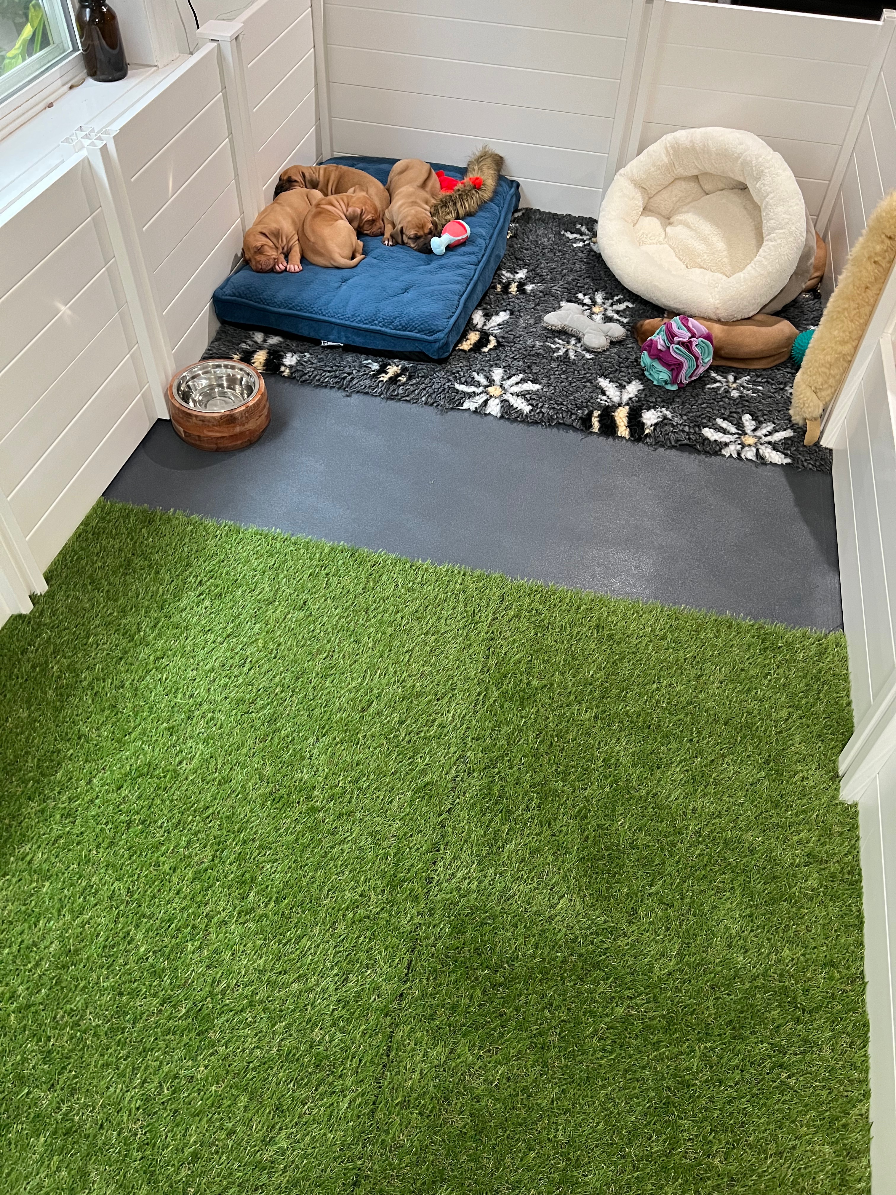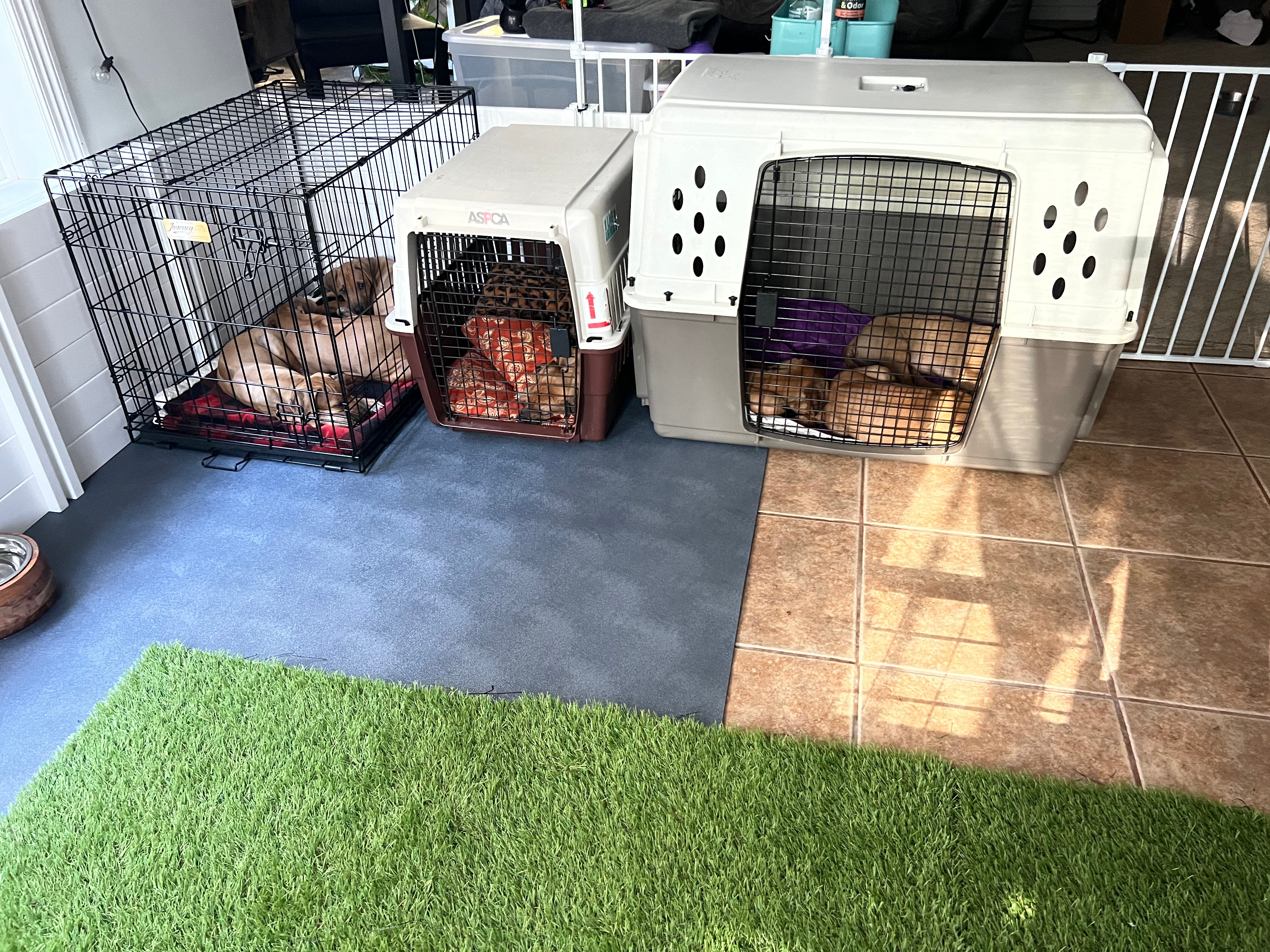 I do litter train (with turf) which gives families a head start on potty training. I also ensure puppies are comfortable and used to a variety of crates (plastic and wire) before going to their new homes. This all helps the transition easier on them and you!